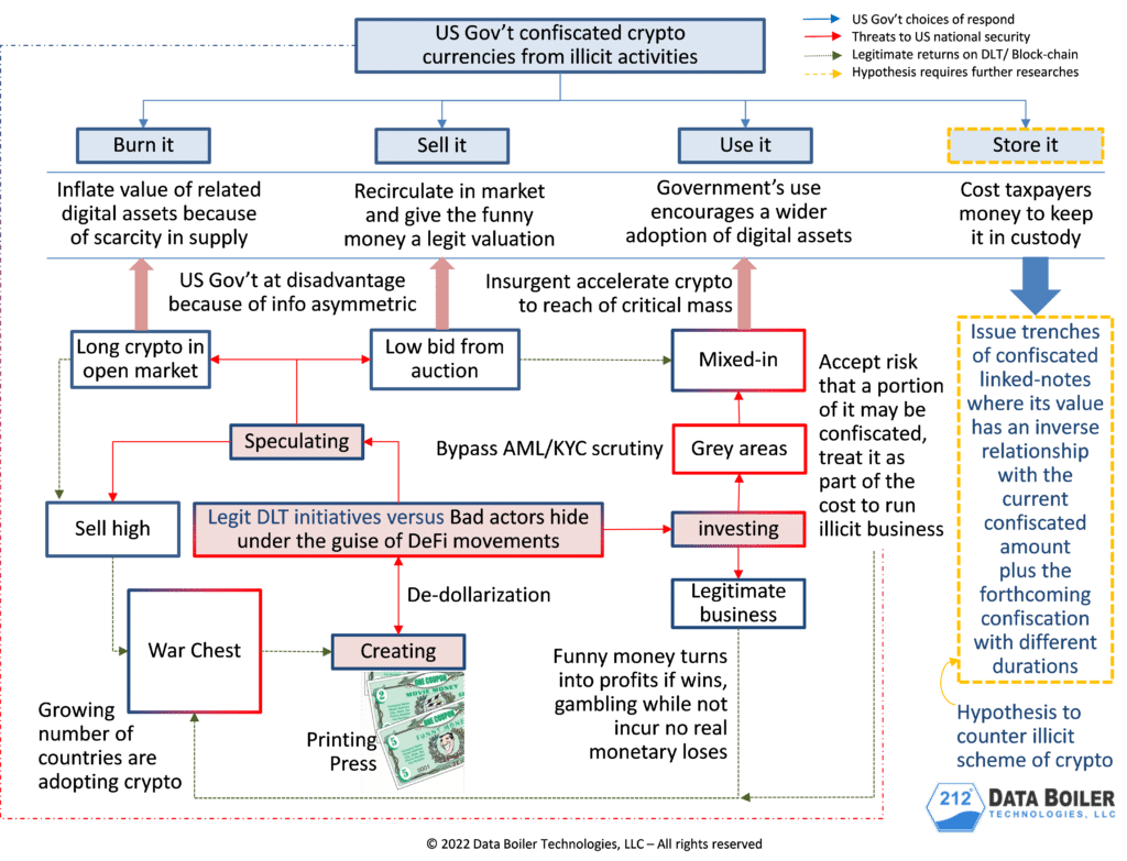 As illustrated above, there is no good way in dealing with confiscated digital assets or crypto meltdown. Burn it, sell it, or use it, all lead to undesirable outcomes. The entire flow mixes-in legitimate DLT (distributed ledger technology) initiatives with potential bad actors / foreign adversaries that hide under the guise of DeFi / De-dollarization movements.