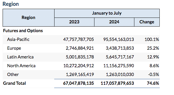 In the first seven months of this year, total exchange-traded options volume for the year was 100.16 billion contracts, up 98.4% from the previous period in 2023, according to trade body FIA.