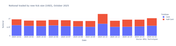 Looking at data from July – September 2025 (which will be used to set tick sizes from November onwards), we find that approximately 1700 tickers will change tick size. While this is only 20% of Reg NMS securities, it corresponds to around 40% of USD traded, as shown in figure 1.