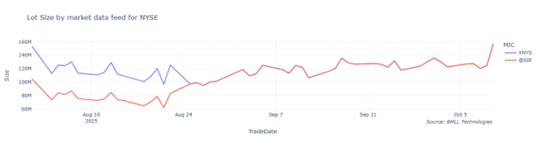 In addition to the SEC rule changes, other recent changes have come into effect. One particular change to note is how trades are reported from NYSE to the SIP. Previously, multiple trades that occurred at a single price and timestamp were bundled into a single report (and therefore not necessarily reported as an odd-lot trade). However, this was changed on August 22, 2025. We can see the effect before and after, as shown in figure 2 below. Previously, the depth feeds (red line, showed a different number of odd-lot traded volume between level 3 feeds and the SIP. However, since the change from the end of August, these two numbers are aligned.