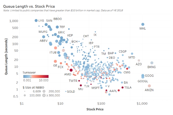 In that context, we will highlight that large-cap tickers with queues above 60 seconds add up to less than 1% of all U.S. equity value traded. Combine that with the fact that one of our latest posts estimated only around 5% of trading is actually institutional investors. It indeed seems big queues might be a relatively small problem.