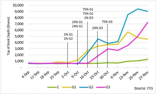 In Chart 2 we can see the impact of phasing in stocks tick pilot participation across the first few weeks of the pilot. Top-of-book depth has increased most dramatically for stocks in group two, which requires quoting and trading in $0.05 increments. The increase in available liquidity is smaller for group three, which requires the same nickel increments but also includes a trade-at provision in the pilot.