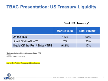 You are looking at a page taken from thepresentation itself(slide 3) in which the TBAC presenter pointed out that there were clear tiers of liquidity in the Treasury market, with 60% of trading activity in the dealer-to-client space concentrated in OTRs, and 40% in OFTRs. In addition, this presenter drilled down into more detail to liquid vs illiquid OFTRs, and stated that within that 40% bucket that 23% of OFTRs were considered liquid and the remaining 17%, illiquid.