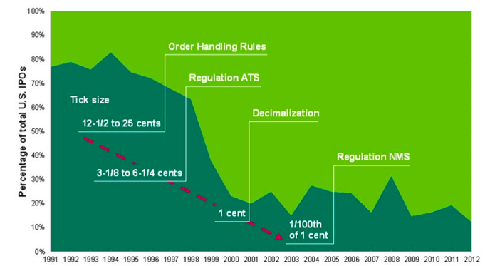 The sub-$50 million initial public offering fell off the cliff in 1998, after new order handling rules defined in 1997, Regulation Alternative Trading System (ATS) and low-tick-size electronic markets gained ground.
