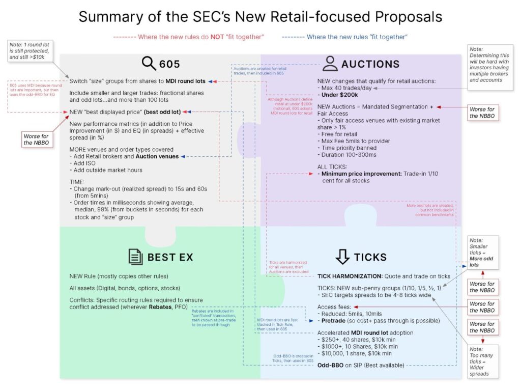 • New Retail Auctions or the “order competition rule”: requires brokers to submit orders to new fair access auctions where anyone can compete to trade with incoming marketable (spread crossing) retail orders. It also includes a minimum 0.1 cent tick for retail.