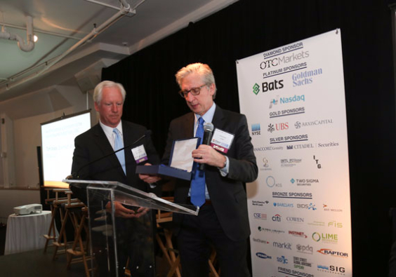Bob Pisani of CNBC presents the Lifetime Achievement Award to Tom Joyce.